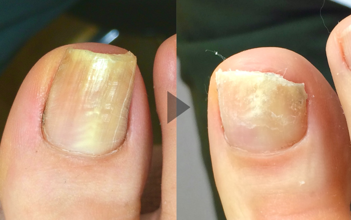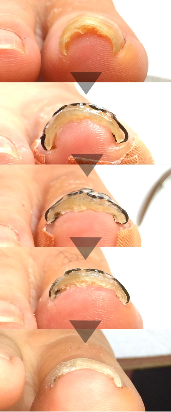 厚みがあって硬い爪でしたので、普通のワイヤー矯正では歯が立たなかったかもしれません。ある程度厚みがなくなってきて、爪のカーブも自己メンテできるレベルに自然になってきたので、卒業して自己ケアに移行します。今後自己メンテを続けることでさらに薄くなっていきます。